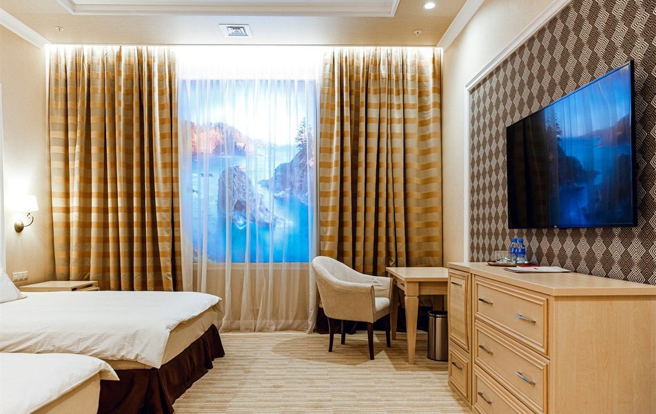 В номере: вешалка, зеркало, кровати односпальные, прикроватные тумбочки, стол, стулья, шкаф, кондиционер, сейф, телевизор, телефон, холодильник