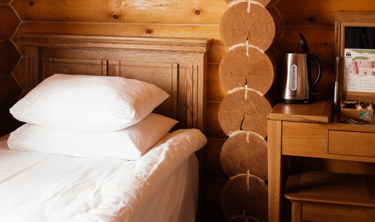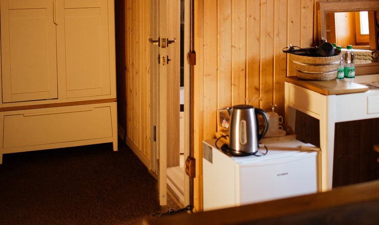 В номере: кровати односпальные, прикроватные тумбочки, стол, стул, шкаф, холодильник, чайный набор посуды, электрочайник