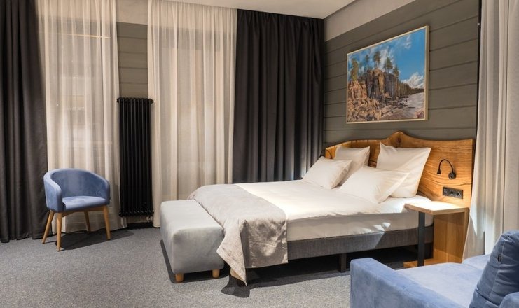 Мебель: Кровать двуспальная, тумба, стол, стул, шкаф, мини-кухня