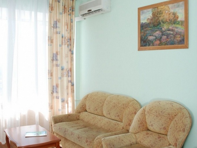 В номере: кровать полутороспальная, комплект - кресло (раскладное), пуфик, тумба прикроватная, журнальный столик, стол туалетный с зеркалом, встроенный шкаф, тумба TV, телевизор, холодильник, кондиционер, телефон